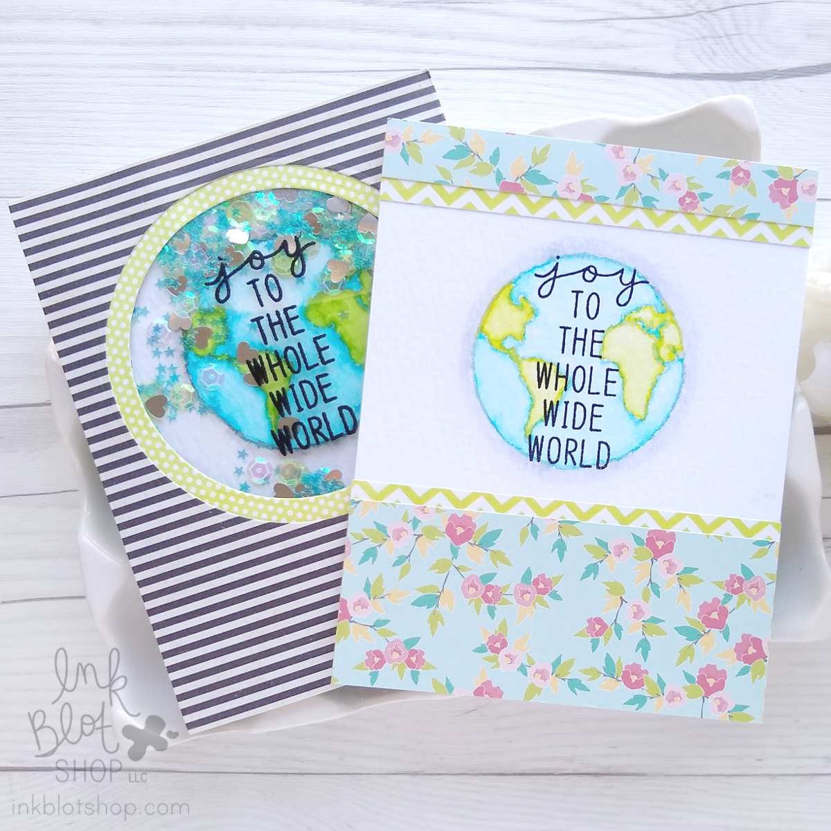 I used the same basic layout (the sentiment over the globe) for both cards, but decided to add a little extra pizzazz to one by turning it into a shaker card. I heat embossed the sentiment on both cards to help it pop.