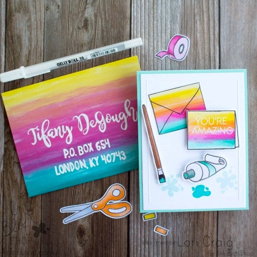 For size reference, the ruler image is approximately 1/2" x 3", and the card and envelope images are approximately 1 1/2" x 2". The scissors are approximately 2 3/4" x 1 1/4".
