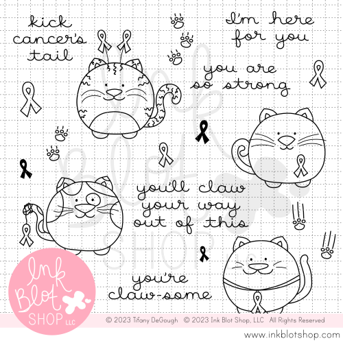 Images included are: fat cat with head bopper awareness ribbons headband, chunky kitty with awareness ribbon pin, chubby cat with awareness ribbon on collar, spotted kitten with awareness ribbon tied onto the tail, paw prints, open and solid awareness ribbons, and paw prints with claw marks. Sentiments included are: "kick cancer's tail", "I'm here for you", "you are so strong", "you'll claw your way out of this", and "you're claw-some".