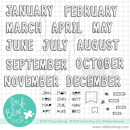 Big Block Monthly Headers (Calendar Builder) is great for use in planners and bullet journaling, and is a great addition to the other Calendar Builder sets. This stamp set includes the following words and icons: January, February, March, April, May, June, July, August, September, October, November, December, JAN, FEB, MAR, APR, MAY, JUN, JUL, AUG, SEP, OCT, NOV, DEC, banners, strips of patterned washi tapes, flowers, and cupcake.