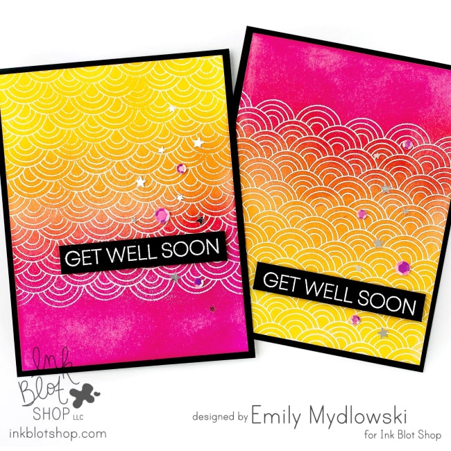 Doodled Rainbow Scoops Background is a 6" x 6" stamp set that includes 1 large doodle-style scalloped background stamp. One edge of this stamp has a rounded finished edge - to give the look of masking without the work. The Doodled Rainbow Scoops Background stamp is large enough to fully cover a standard A2 (4 1/4" x 5 1/2") card front...plus some!