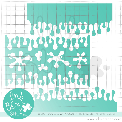 Drips & Splats is a 6" x 6" stencil set that includes 3 stencil pieces. Use the Drips & Splats stencil for creating drip borders and/or splat images.