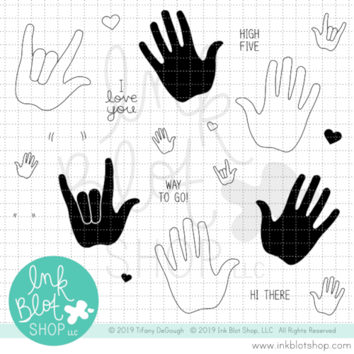 Hand It To You includes a variety of hand images in both outline and solid shapes, along with coordinating sentiments. The images/phrases included are: "I love you", "High Five", "Way To Go!", "Hi There", solid and outline open left hands, solid and outline open right hands, solid and outline ASL I love you sign hands, shake marks, and hearts.