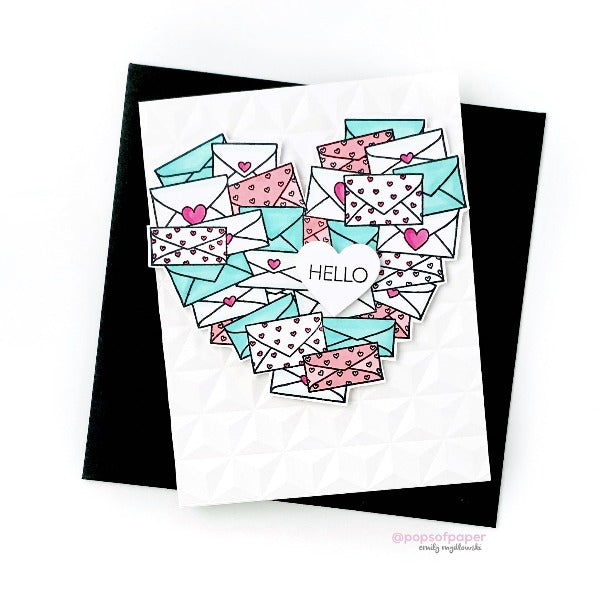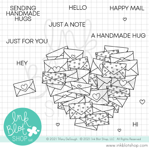 Happy Mail Heart includes the following images and phrases: heart-shaped pile of envelopes, individual envelope with heart on the flap, "Hello", "Sending Handmade Hugs", "Happy Mail", "Hi", "Just A Note", "Just For You", "Hey", "A Handmade Hug", and hearts.