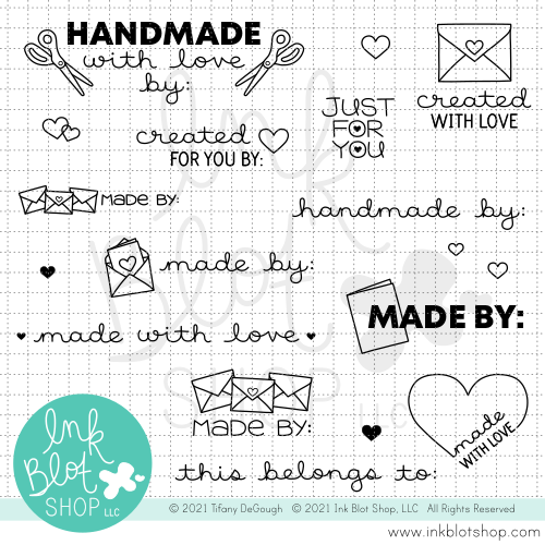 Made For You is a 4" x 6" stamp set that includes 18 individual stamps. This stamp set includes a variety of craft-related stamps that are perfect for stamping on the back of your handmade cards, for creating tags to go on your handcrafted items, and some can also be used to decorate a coordinating envelope.