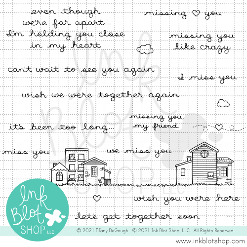 Missing You includes the following images and scripty sentiments: houses and apartments in separate neighborhoods connected by grass, clouds, heart, heart in dotted trail, "let's get together soon", "it's been too long...", "wish you were here", "wish we were together again", "can't wait to see you again", "we miss you", "missing you, my friend", "even though we're far apart...I'm holding you close in my heart", "missing you like crazy", "I miss you", "miss you", "missing you" with a heart, and ellipsis. (This cursive handwriting font is exclusive to Ink Blot Shop.)