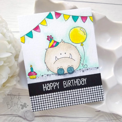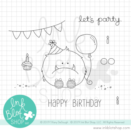 Party Monster includes a variety of party scene building images and coordinating sentiments. The images/phrases included are: monster with party hat holding a balloon, "let's party", "Happy Birthday", hanging banner, cupcake with a candle, confetti sprinkles, googly eyes, and candles.