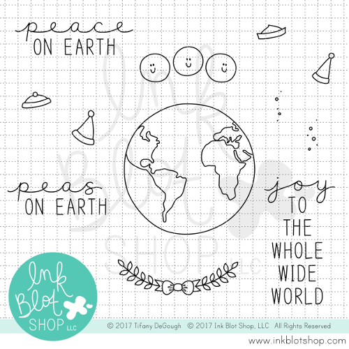 Peas on Earth includes the following images: earth, row of 3 peas, beanie-style hat, 2 pointed winter hats, elf hat, bow and branches, and falling snow. Also included are the sentiments/phrases: "peace on earth", "peas on earth", and "joy to the whole wide world".