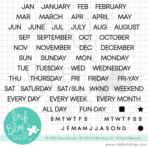 Planner Months & Days (Calendar Builder) is great for use in planners and bullet journaling. This stamp set includes the following words and icons: January, February, March, April, May, June, July, August, September, October, November, December, Sunday, Monday, Tuesday, Wednesday, Thursday, Friday, Saturday, Sunday, JAN, FEB, MAR, APR, MAY, JUN, JUL, AUG, SEP, OCT, NOV, DEC, SUN, MON, TUE, WED, THU, FRI, SAT, FRI-YAY, SAT/SUN, WKND, WEEKEND, every day, every week, every month, all day, fun-day, two weekday headers, single-letter month abbreviation header, square, circle, and star.