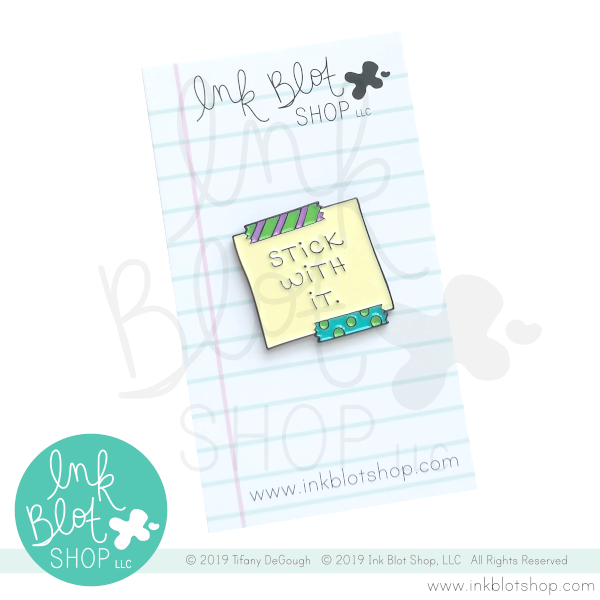 This Stick With It Note collectible enamel pin measures approximately 1" x 1" and features a yellow enamel piece of paper with the words "Stick With It" in black metal and teal, green, and purple enamel striped and polka-dotted washi tape in a black-dyed nickel plated metal design. This is a custom die struck soft enamel pin with one post and a black rubber clutch.