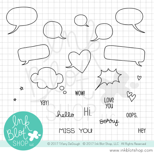Tiny Bubbles includes the following words and images: wow!, yay!, Hi., oops., love you, sorry, miss, you, hey, hello, speech bubbles, thought cloud with separate bubble trail, dynamic speech bubble, stars, hearts.