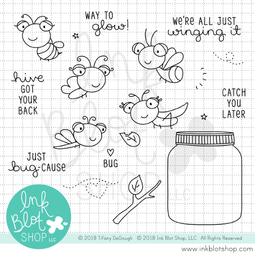 Winging It includes a variety of critter images as well as other scene building images and coordinating punny sentiments. The images/phrases included are: firefly/lightning bug, butterfly, bee, dragonfly, grasshopper, "we're all just winging it", "catch you later", "♥ bug", "hive got your back", "just bug-cause", "way to glow!", light rays, looped flight trail, flight trail with heart, mason jar with lid, twig/stick, leaf with bite taken out, and stars.